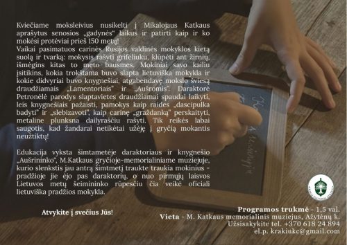 Projekto metu edukacinių programų kūrėja Daiva Amankavičienė sukūrė įtraukią edukacinę programą moksleiviams KNYGNEŠIŲ IR DARAKTORIŲ GADYNĖ, arba „Kaip mokslą ėjo mūsų protėviai“, kuri vykdoma M. Katkaus memorialiniame muziejuje. Taip pat parengta patraukli ekskursijos programa muziejaus lankytojams. Krakėse, šalia V. Ulevičiaus skulptūros knygnešiams, įrengta informacinė lenta apie Krakių krašto knygnešius.